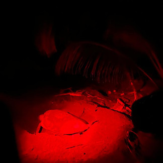 Das erste Bild scheint überbelichtet zu sein, wegen das grellen roten Lichts, dadurch hat man jedoch einen guten Blick auf die Eier, welche die Schildkröte gelegt hatte. Insgesamt legt eine Schildkröte während ihrer Brutsaison 2000 Eier, wovon aber nur zehn Prozent überleben. Noch deutlich weniger schaffen den Weg zum Ozean und die erste Zeit im Meer.